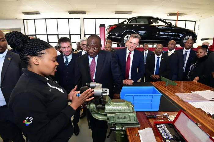 President Ramaphosa tour the Mercedes-Benz Learning Academy in East London. The facility is a locally based skills and artisans development Centre and a Public Private Partnership (PPP) between Mercedes-Benz, the National Treasury and the Jobs Fund.