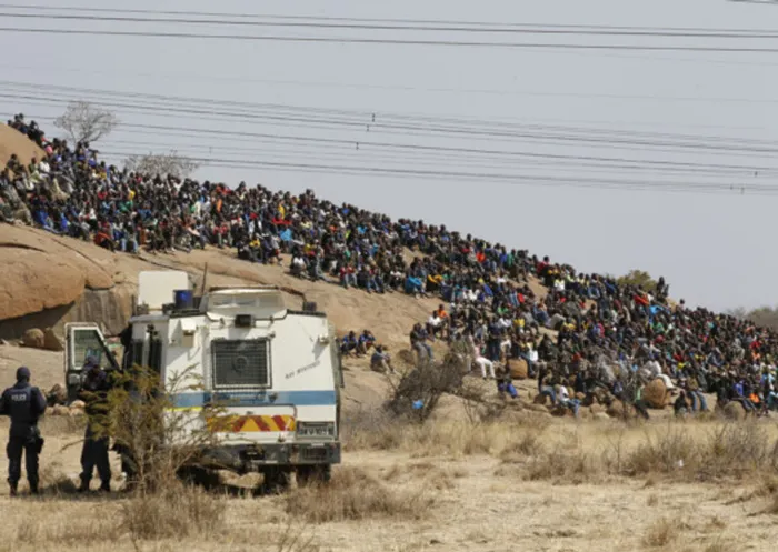 File picture - Policemen keep watch on the protesters outside a South African mine in Rustenburg, 100 km (62 miles) northwest of Johannesburg, August 16, 2012. South African police opened fire against thousands of striking miners armed with machetes and sticks at Lonmin's Marikana platinum mine, leaving several bloodied corpses lying on the ground. REUTERS/Siphiwe Sibeko File picture - Policemen keep watch on the protesters outside a South African mine in Rustenburg, 100 km (62 miles) northwest of Johannesburg, August 16, 2012. South African police opened fire against thousands of striking miners armed with machetes and sticks at Lonmin's Marikana platinum mine, leaving several bloodied corpses lying on the ground. REUTERS/Siphiwe Sibeko
