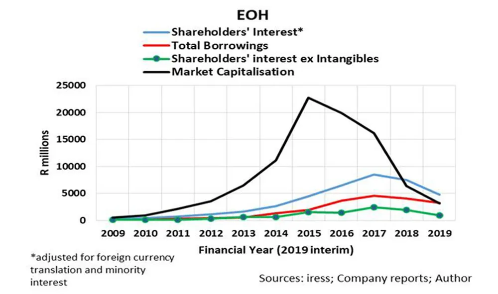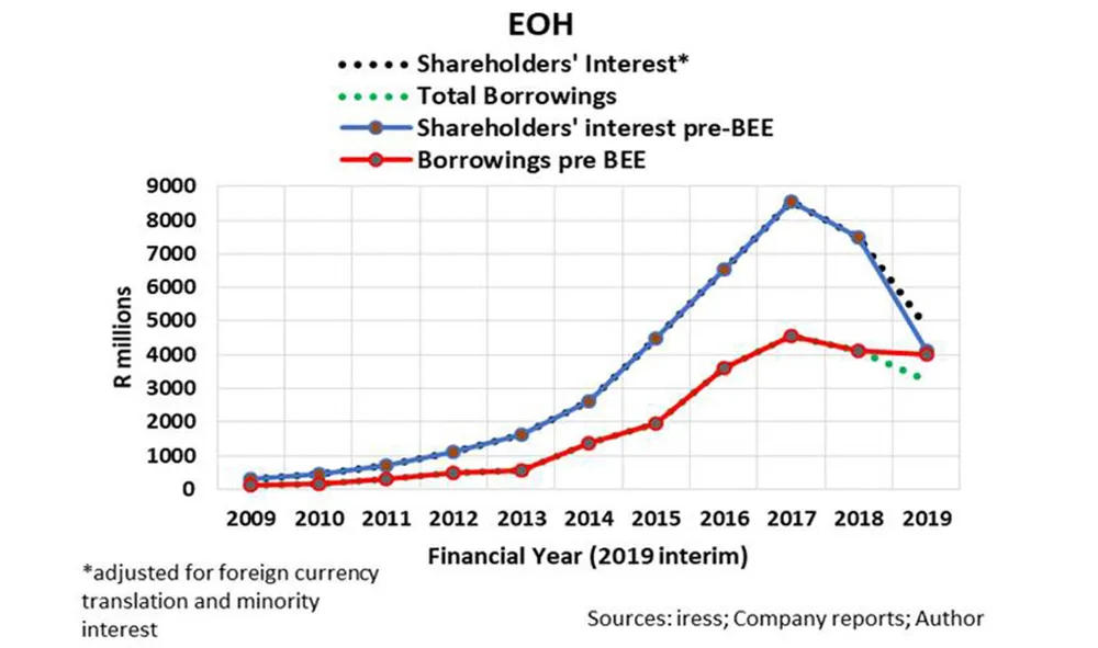 But what about EOH as company? Will it survive the onslaughts? From the 2019 interim results it became clear that the company could be in serious trouble if it was not for the R750m capital injection by Lebashe. My “debt death cross”, when total borrowings exceed shareholders’ interest, would have set in.