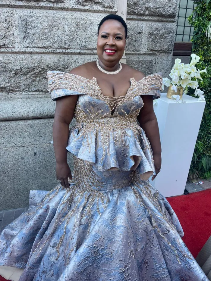 To complete her look, Ntshalintshali paired the gown with a diamond choker-style necklace, adding a touch of luxury and sophistication.