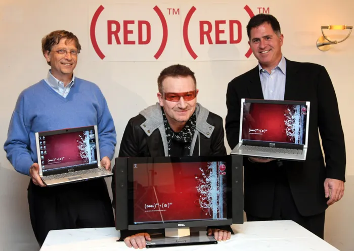 Microsoft founder Bill Gates, left, singer Bono, and Michael Dell, founder and Chairman of Dell Inc, introduce a series of Dell RED personal computers powered by Windows Vista Ultimate, in Davos, Switzerland. Microsoft founder Bill Gates, left, singer Bono, and Michael Dell, founder and Chairman of Dell Inc, introduce a series of Dell RED personal computers powered by Windows Vista Ultimate, in Davos, Switzerland.