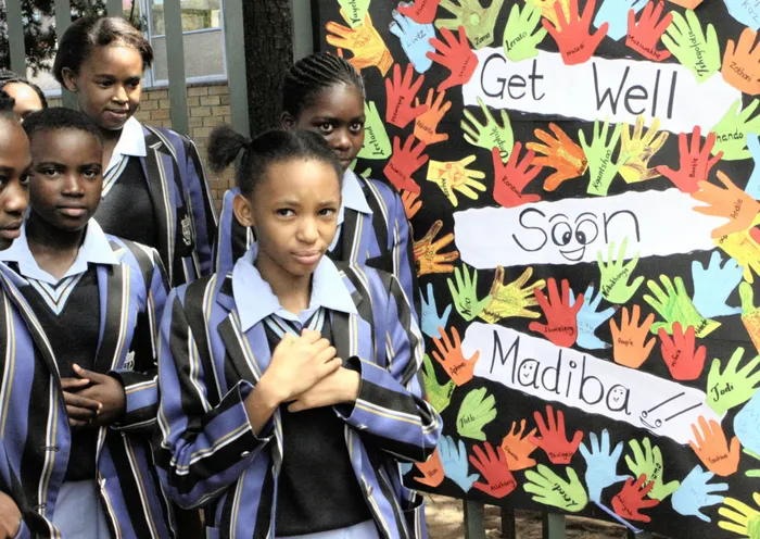 Students from a school adjacent to the hospital where former South African president Nelson Mandela is being treated make their way past a giant get-well card. Students from a school adjacent to the hospital where former South African president Nelson Mandela is being treated make their way past a giant get-well card.
