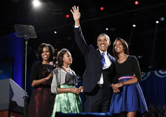 US President Barack Obama with his wife Michelle Obama and daughters Sasha and Malia during his election night victory rally in Chicago. US President Barack Obama with his wife Michelle Obama and daughters Sasha and Malia during his election night victory rally in Chicago.