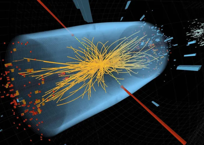 This undated image made available by CERN shows a typical candidate event in the search for the Higgs boson, including two high-energy photons whose energy (depicted by red lines) is measured in the CMS electromagnetic calorimeter. This undated image made available by CERN shows a typical candidate event in the search for the Higgs boson, including two high-energy photons whose energy (depicted by red lines) is measured in the CMS electromagnetic calorimeter.
