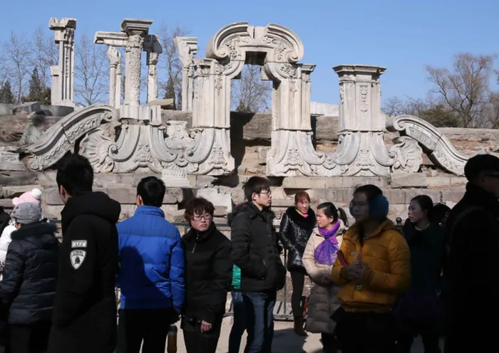 Visitors gather before the Great Fountain Ruins in the Old Summer Palace, known in Chinese as Yuan Ming Yuan, in Beijing. Visitors gather before the Great Fountain Ruins in the Old Summer Palace, known in Chinese as Yuan Ming Yuan, in Beijing.