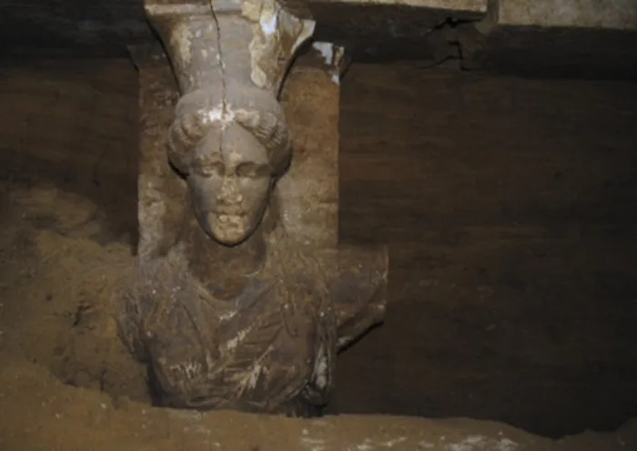 A sculpted female figure, known as Caryatid, is seen inside a site of an archaelogical excavation at the town of Amphipolis. A sculpted female figure, known as Caryatid, is seen inside a site of an archaelogical excavation at the town of Amphipolis.