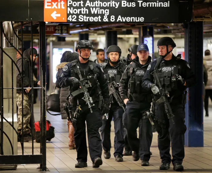 Police officers patrol in the passageway connecting New York City's Port Authority bus terminal and the Times Square subway station. Picture: AP Photo/Seth Wenig Police officers patrol in the passageway connecting New York City's Port Authority bus terminal and the Times Square subway station. Picture: AP Photo/Seth Wenig