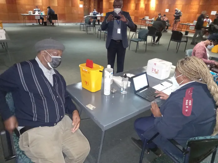 Mfundi Vundla and his wife joined numerous elderly citizens who arrived early in the CBD to register and get vaccinated following the clarion call by the government for elderly members of society who are more likely to fall ill from coronavirus to begin receiving vaccinations.