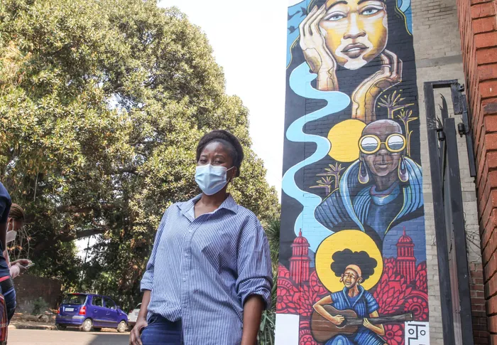Victoria Boshoga with the new mural on the Tshwane Leadership Foundation building, Burgers Park Lane. Picture: Jacques Naude African News Agency (ANA)