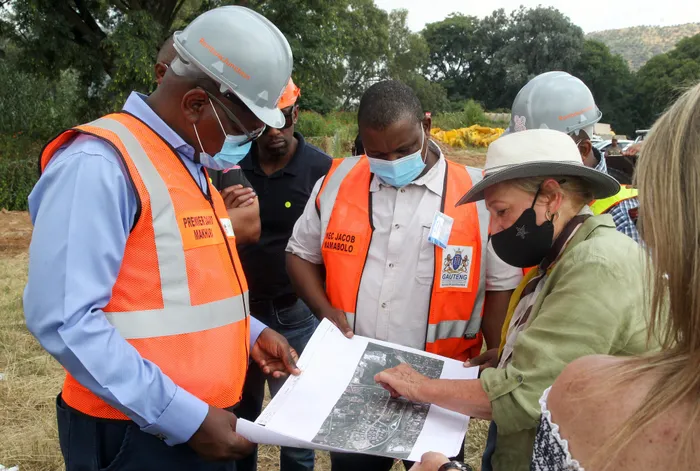 Gauteng Premier David Makhura and Transport MEC Jacob Mamabolo with Rainbow Junction joint CEO Rosella Dingle at the Apies River development. Picture: Jacques Naude/African News Agency (ANA)