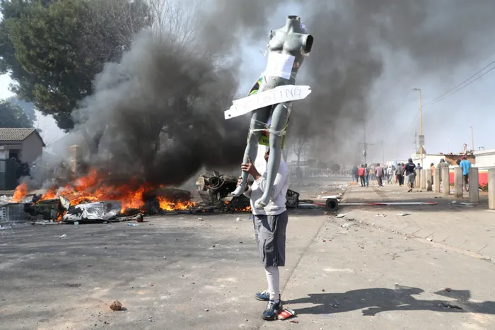 A man holds up a mannequin with messages on as residents of Tembisa embarked on a service delivery protest, burning cars and infrastructure. Picture: Oupa Mokoena/African News Agency (ANA)