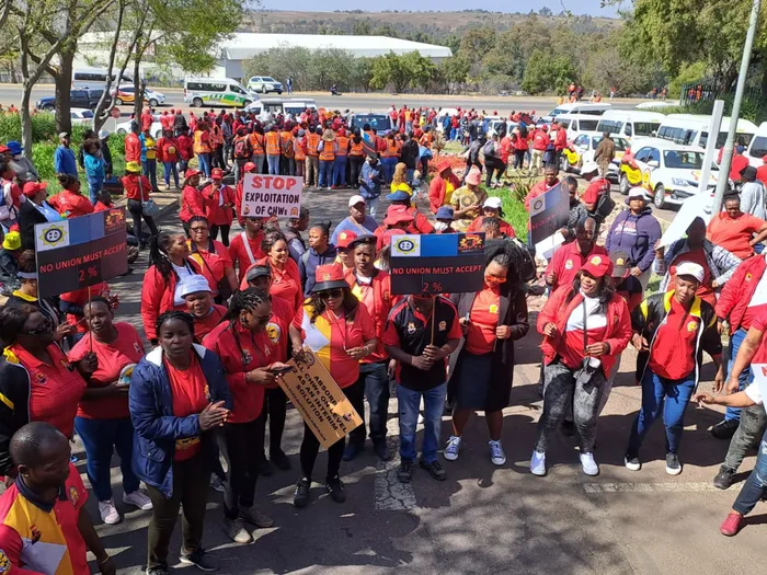 Addressing protesters, union secretary Solly Malema said: “We don’t want 2% (salary increment). They gave themselves 3% (salary increase) these old Parliamentarians, but when we were busy fighting Covid-19 they were working from home.”