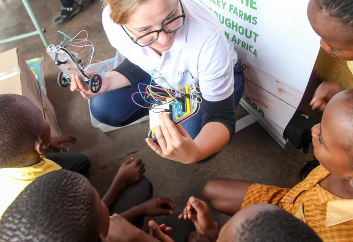 Erin Lowe demonstrates a robotics kit to pupils during a visit by ANC treasurer-general Dr Gwen Ramokgopa to Matseke Primary School in Atteridgeville. Picture: Jacques Naude/African News Agency (ANA)