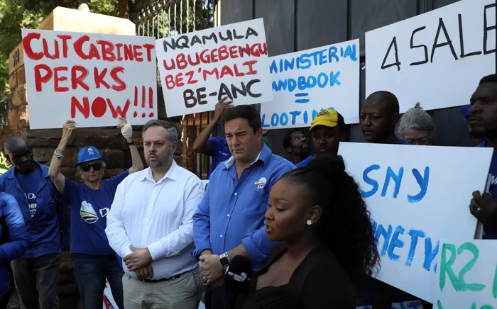 DA leader John Steenhuisen and party members picket outside the luxurious ministerial estate, Bryntirion, in Pretoria. Picture: Oupa Mokoena/ African News Agency (ANA)