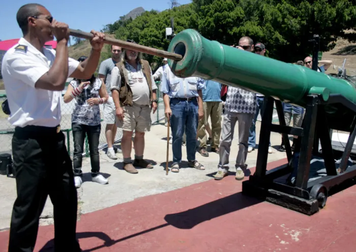 People watch on as Petty Officer Alistair Maasdorp loads a canon in preparation for the noon gun