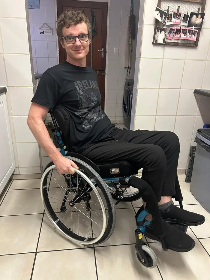 Following emergency treatment — including high-dose steroids, immunotherapy and plasma exchange — Tinus was transferred to a specialised spinal rehabilitation hospital. There, he spent six weeks relearning essential daily tasks: dressing himself, transferring safely into a wheelchair, and adapting to a new way of living.
