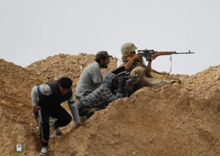 An anti-Muammar Gaddafi fighter fires a sniper rifle at the frontline in Sirte. An anti-Muammar Gaddafi fighter fires a sniper rifle at the frontline in Sirte.