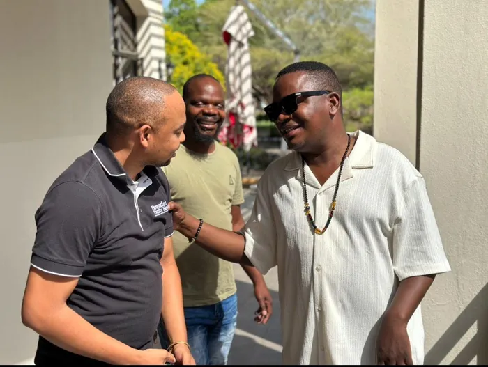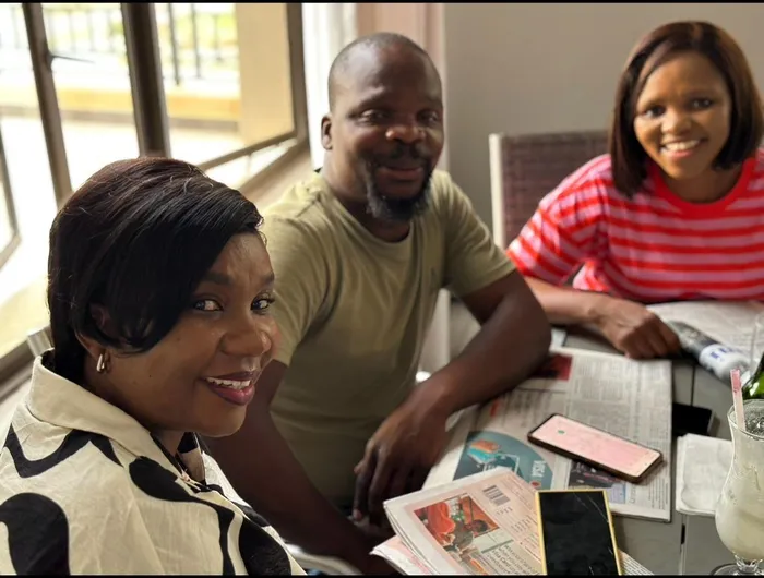 The late Aserie Ndlovu in the company of friends and colleagues Lesego Mathibela and Khaya Khumalo at the African Media and Communicators Forum's end of year networking session in Midrand, in December 2024.