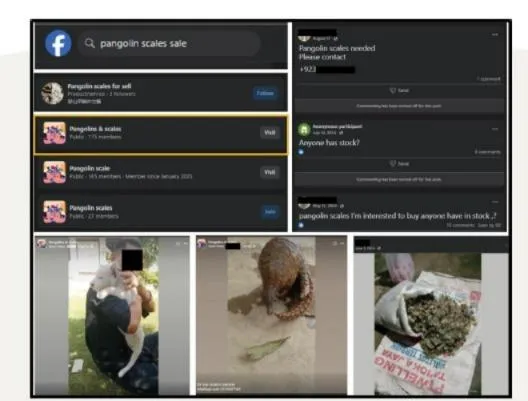 An example search for ‘pangolin scales sale’ yielded several groups and pages. On one, users inquire about buying pangolins/scales and provide their contact details. Researchers found videos and images on the pages that showed users with pangolins, bags of pangolin scales, and even lion cubs advertised for sale.
