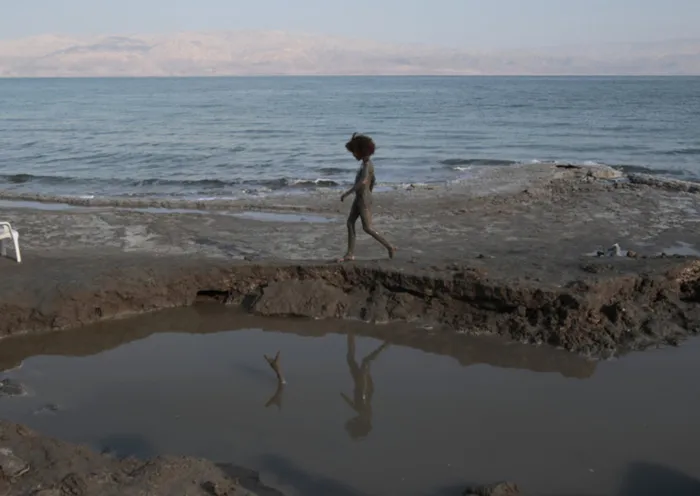 A boy covered with mud walks on the shore of the Dead Sea near the West Bank Jewish settlement of Mitzpe Shalem. A boy covered with mud walks on the shore of the Dead Sea near the West Bank Jewish settlement of Mitzpe Shalem.