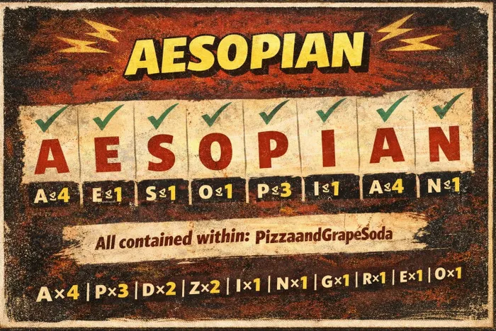 It was this background that I brought to the phrase “Pizza and Grape Soda.” I approached it as a semiotician would approach a name or symbolic text. I listed the exact letters contained in the phrase and worked strictly within that fixed set. The phrase had to reveal its own internal vocabulary without invention or manipulation. The first extraction that emerged was Aesopian, fully contained within the letters of “Pizza and Grape Soda.” This finding is letter-faithful and undisputed. It arises directly from the phrase itself. Aesopian language historically refers to veiled or indirect speech used by elites and closed networks who communicate in ways that appear innocent to outsiders while carrying deeper implications for insiders.