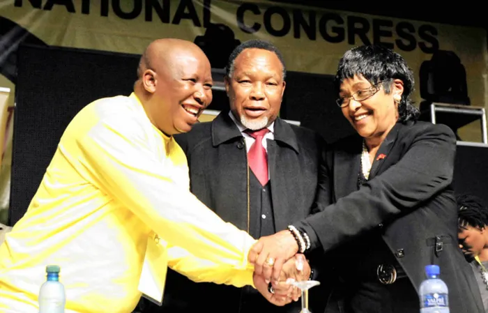 Julius Malema is congratulated by deputy president Kgalema Motlanthe and Winnie Madikizela-Mandela after being re-elected as president of the ANC youth league. Picture: Bongiwe Mchunu Julius Malema is congratulated by deputy president Kgalema Motlanthe and Winnie Madikizela-Mandela after being re-elected as president of the ANC youth league. Picture: Bongiwe Mchunu