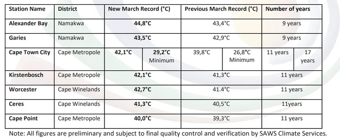 SAWS recently confirmed that several weather stations across the Namakwa District and the Western Cape have officially broken their long-standing maximum temperature records for March.