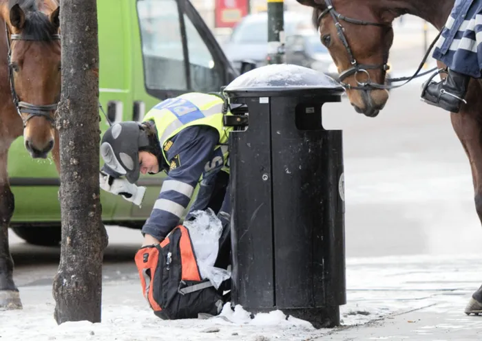 A police officer searches through a bag in Stockholm. A police officer searches through a bag in Stockholm.