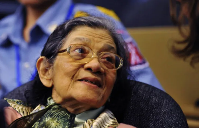 In this photo released by the Extraordinary Chambers in the Courts of Cambodia, Ieng Thirith, foreground, former Minister of Social Affairs, smiles during a hearing of the former Khmer Rouge top leaders, in Phnom Penh, Cambodia, Wednesday, Oct. 19, 2011. Cambodia's war crimes tribunal will begin its long-awaited full-scale trial of the top surviving leaders of the genocidal Khmer Rouge regime late next month, the panel announced Tuesday, Oct. 18, 2011. (AP Photo/Mark Peters, Extraordinary Chambers in the Courts of Cambodia) In this photo released by the Extraordinary Chambers in the Courts of Cambodia, Ieng Thirith, foreground, former Minister of Social Affairs, smiles during a hearing of the former Khmer Rouge top leaders, in Phnom Penh, Cambodia, Wednesday, Oct. 19, 2011. Cambodia's war crimes tribunal will begin its long-awaited full-scale trial of the top surviving leaders of the genocidal Khmer Rouge regime late next month, the panel announced Tuesday, Oct. 18, 2011. (AP Photo/Mark Peters, Extraordinary Chambers in the Courts of Cambodia)