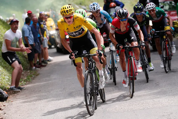 Chris Froome, wearing the overall leader's yellow jersey, and Italy's Fabio Aru, far right, climb towards Mont du Chat pass on Sunday. Photo: Christophe Ena, AP Chris Froome, wearing the overall leader's yellow jersey, and Italy's Fabio Aru, far right, climb towards Mont du Chat pass on Sunday. Photo: Christophe Ena, AP