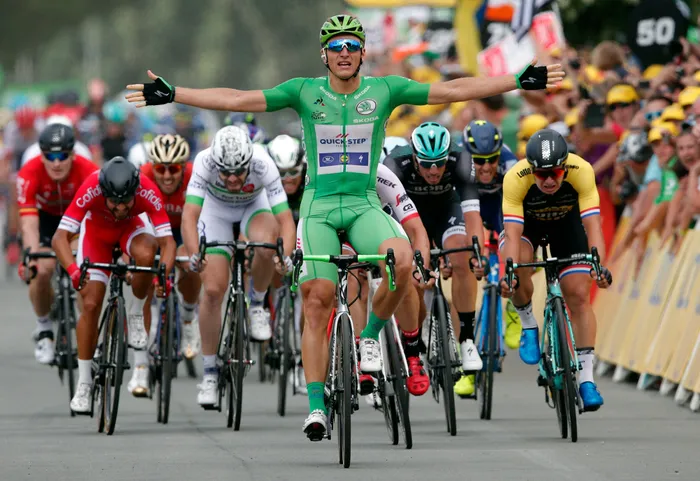 Marcel Kittel, wearing the best sprinter's green jersey, celebrates as he crosses the finish line to win the tenth stage of the Tour de France. Photo: AP Photo/Christophe Ena Marcel Kittel, wearing the best sprinter's green jersey, celebrates as he crosses the finish line to win the tenth stage of the Tour de France. Photo: AP Photo/Christophe Ena
