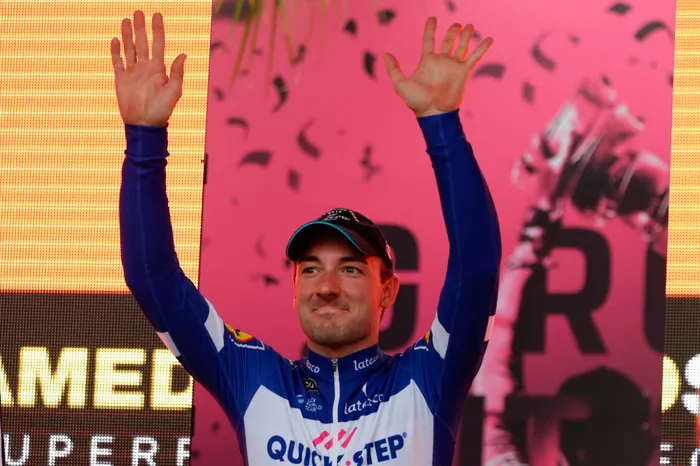 Italian cyclist Elia Viviani celebrates on the podium after the third stage of the Giro d'Italia on Sunday. Photo: Ariel Schalit/AP Italian cyclist Elia Viviani celebrates on the podium after the third stage of the Giro d'Italia on Sunday. Photo: Ariel Schalit/AP