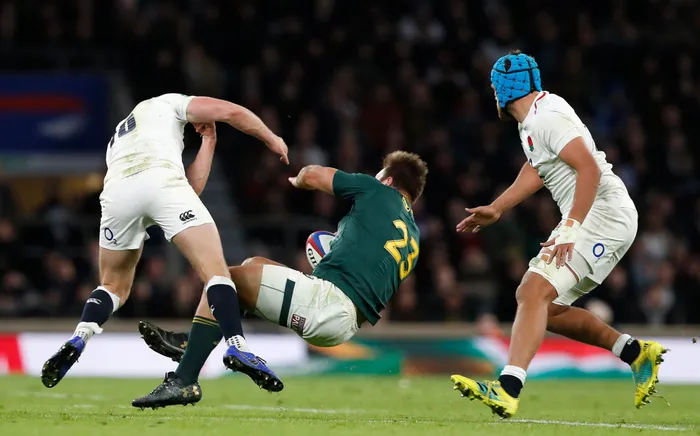 England's Owen Farrell, left, tackles South Africa's Andre Esterhuizen near the end during the rugby Test at Twickenham stadium in London on Saturday, Photo: AP Photo/Alastair Grant England's Owen Farrell, left, tackles South Africa's Andre Esterhuizen near the end during the rugby Test at Twickenham stadium in London on Saturday, Photo: AP Photo/Alastair Grant
