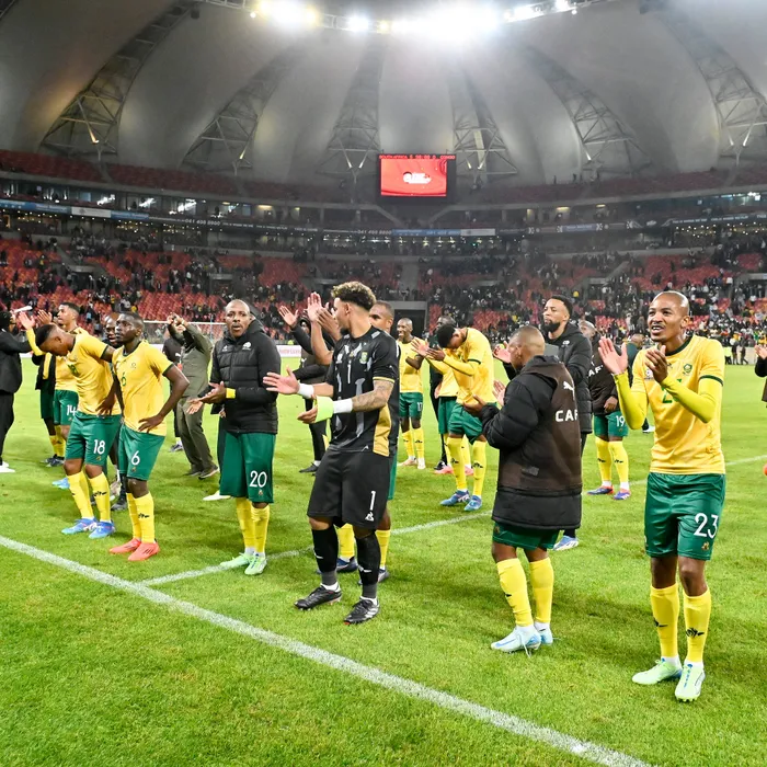 Bafana Bafana players celebrate during the 2025 Africa Cup of Nations Qualifiers match between South Africa and Congo at the Nelson Mandela Bay Stadium in Gqeberha last night. BackpagePix