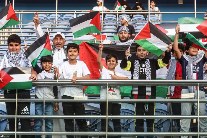 Supporters waving Palestinian flags pose for a picture prior to their 2026 FIFA World Cup AFC qualifier against Australia at Jaber Al-Ahmad International Stadium in Kuwait City Supporters waving Palestinian flags pose for a picture prior to their 2026 FIFA World Cup AFC qualifier against Australia at Jaber Al-Ahmad International Stadium in Kuwait City. Photo: Yasser Al-Zayyat/AFP