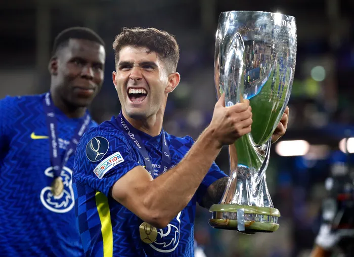 Chelsea's Christian Pulisic celebrates with the European Super Cup trophy after winning the penalty shoot-out against Villarreal Chelsea's Christian Pulisic celebrates with the European Super Cup trophy after winning the penalty shoot-out against Villarreal. Photo: Jason Cairnduff/Reuters