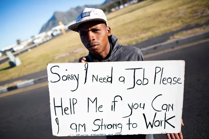 An unemployed man offers his services at a traffic intersection. Picture: EPA An unemployed man offers his services at a traffic intersection. Picture: EPA