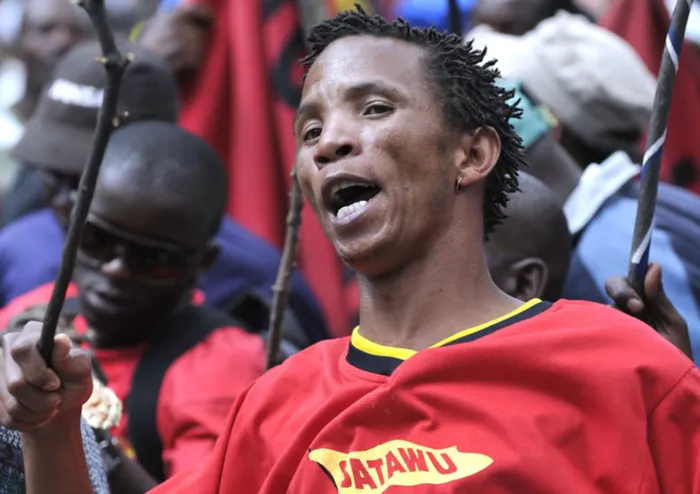 One of hundreds of Satawu and Giwusa members chant slogans as they gather around Beyers Naude Square in the Joburg CBD for a protest demanding better wages. Picture: Bongiwe Mchunu One of hundreds of Satawu and Giwusa members chant slogans as they gather around Beyers Naude Square in the Joburg CBD for a protest demanding better wages. Picture: Bongiwe Mchunu